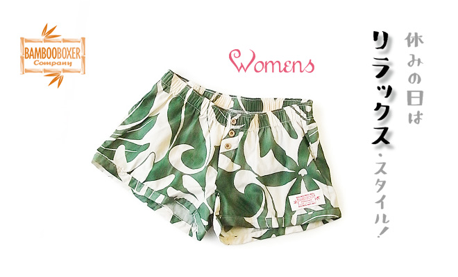 バンブーボクサーショートパンツ(Womens) 全面ウエストゴム仕様の楽な履き心地、左前裾にロゴタグ付き。 前にココナッツボタンがついています。 Made in Hawaii 100%COTTON