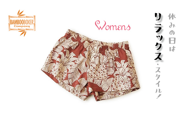 バンブーボクサーショートパンツ(Womens) 全面ウエストゴム仕様の楽な履き心地。 前にココナッツボタンがついています。 Made in Hawaii 100%COTTON